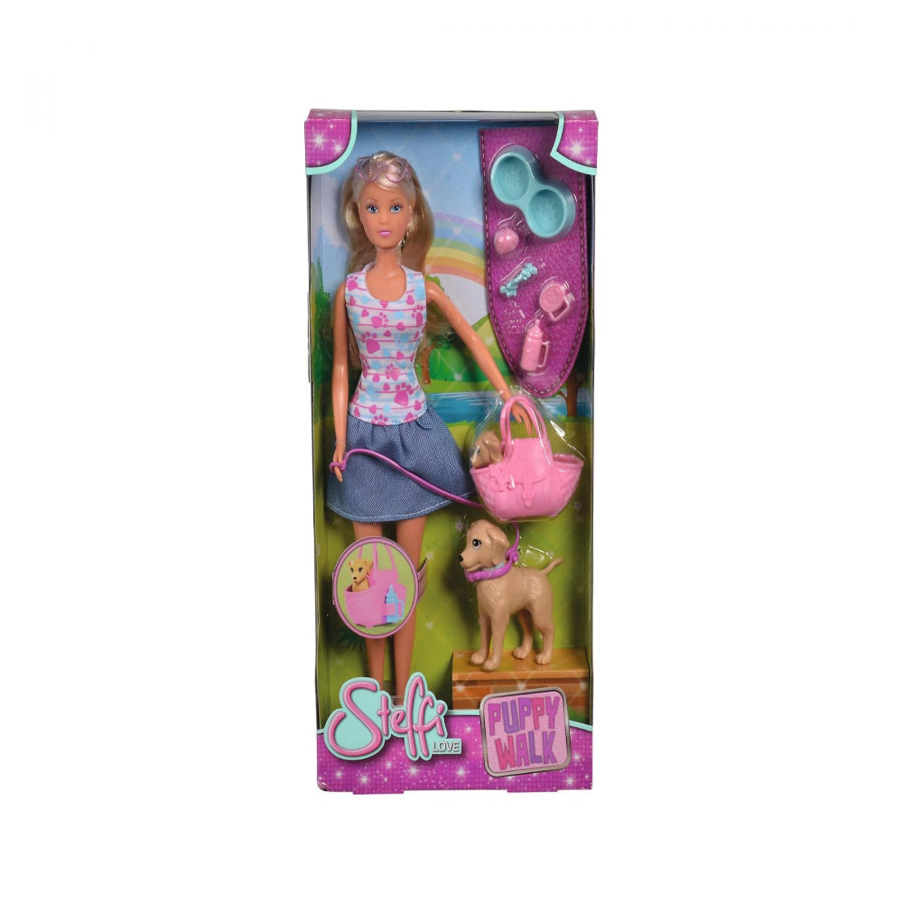 Steffi wears a fashionable dress with cute paw print patterns and walks her dog, who recently became a mother. You can carry the little puppy in a pink carry bag and take it with you on the road. The set also includes great dog accessories. Steffi LOVE 29 cm “Walks his dog” from Simba Toys is suitable for children from 3 years.