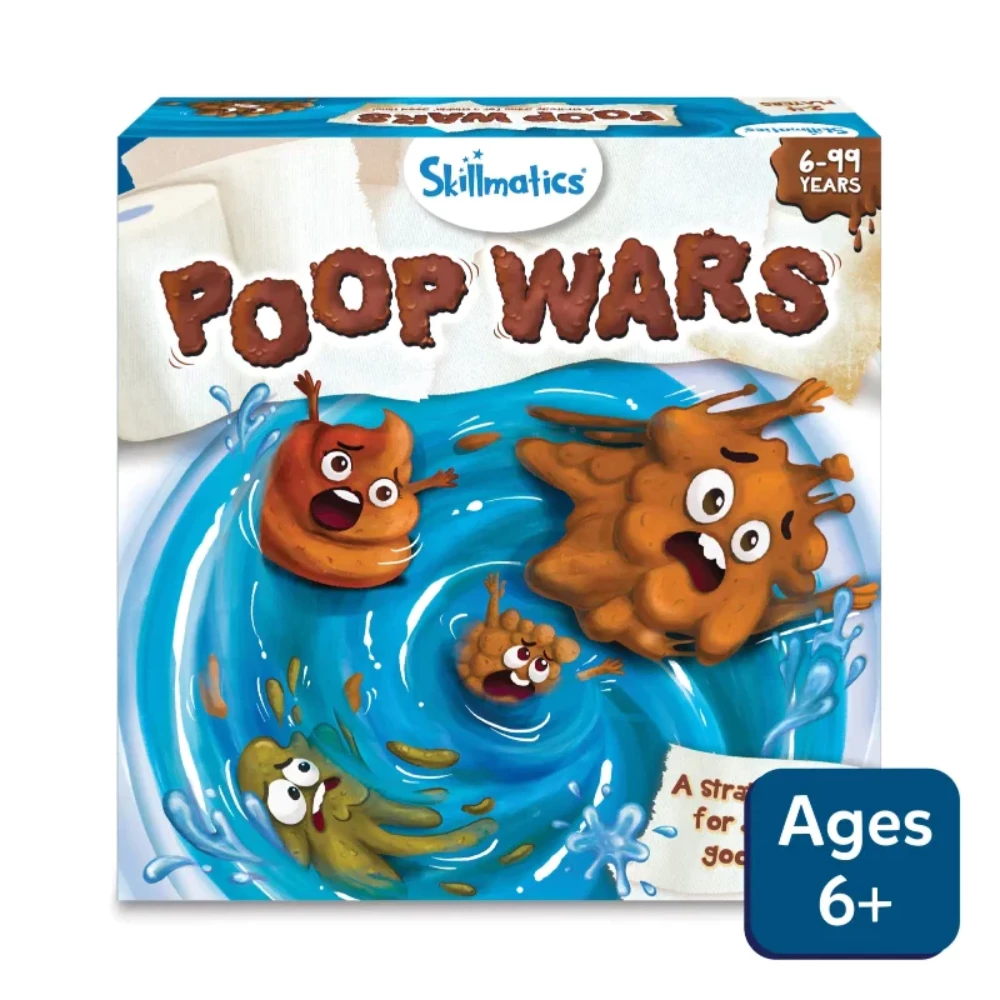 Are you ready for this outrageously fun poop-off? Pick your poop personality from this smelly lineup – Runny Rob, Stony Sid, Perfect Pam, and Gooey Gus, and plop them into different toilet bowls! Roll the die & strategize to survive getting flushed into the sewage swirl! Save yourself from getting tossed around and try to surf back up every chance you get. Remember, the last one floating wins!