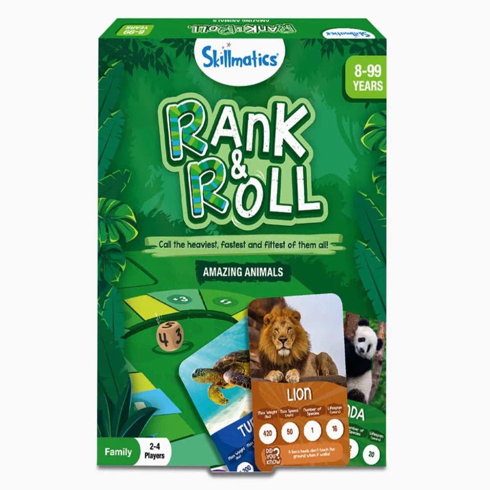 Rank and Roll is a memory and strategy board game – remember what’s on your cards and play the one with heaviest, fastest or fittest animal! Challenge your memory and race to the finish!