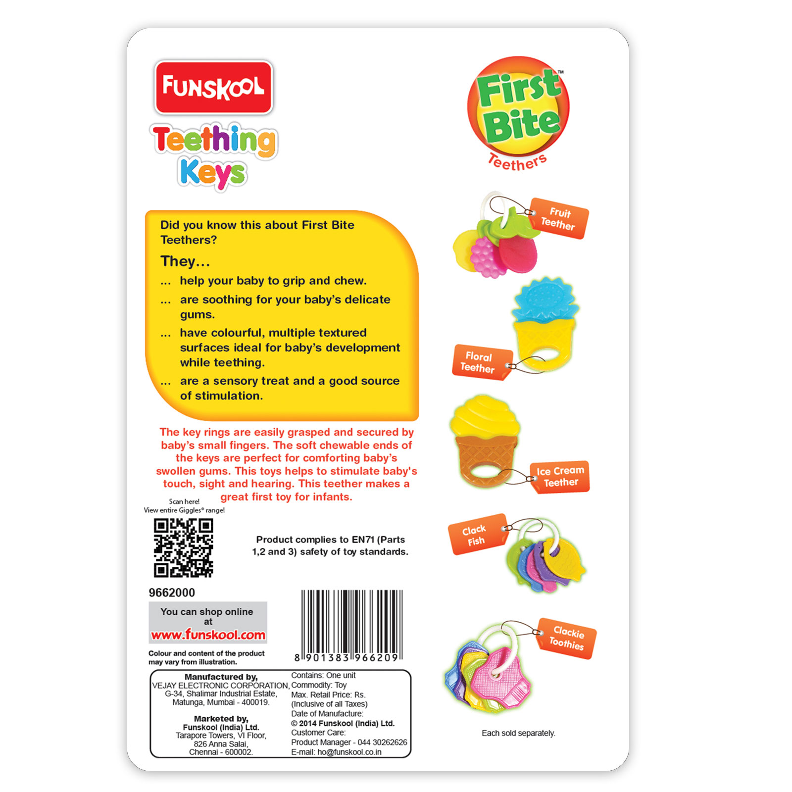 The key rings are easily grasped and secured by baby’s small fingers. The soft chewable ends of the keys are perfect for comforting baby’s swollen gums. This toy helps to stimulate baby’s touch, sight, and hearing. This teether makes a great first toy for infants.